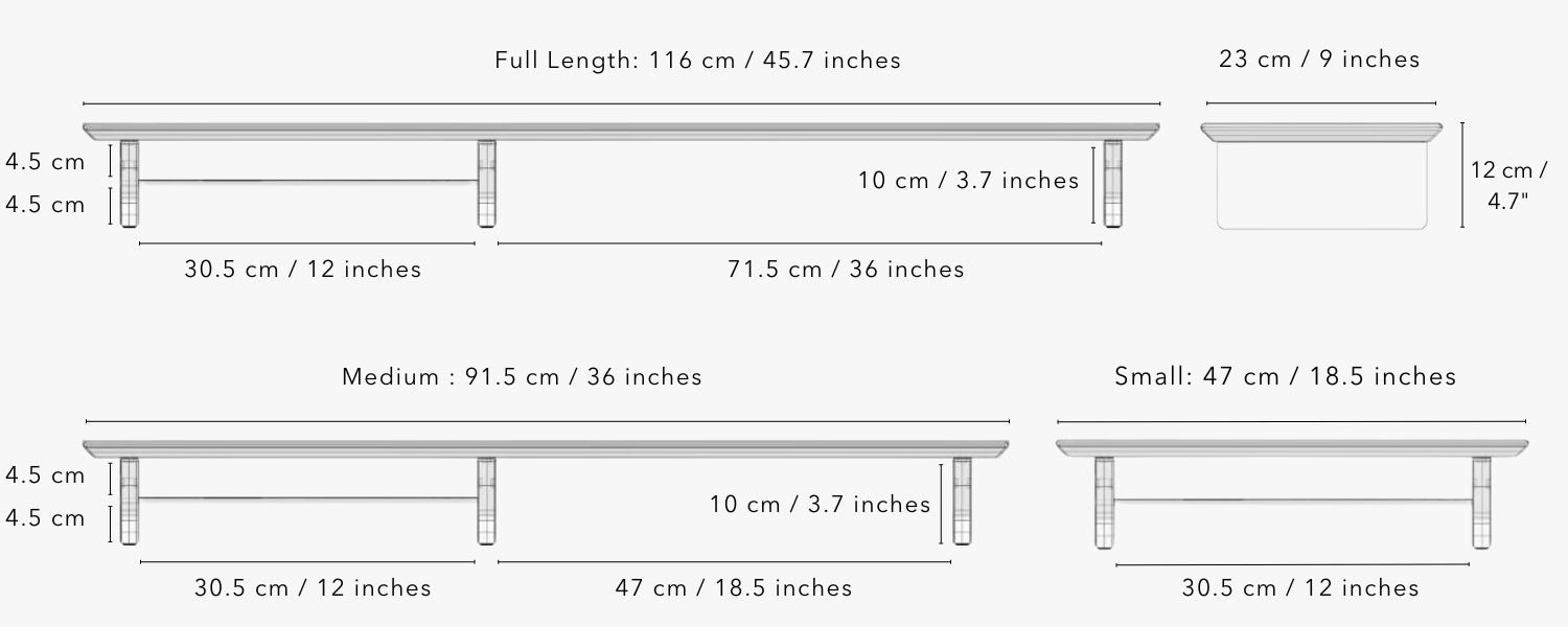 - Medium : [91.5 x 23 x 11] cm | [36 x 4.5 x 9] inches